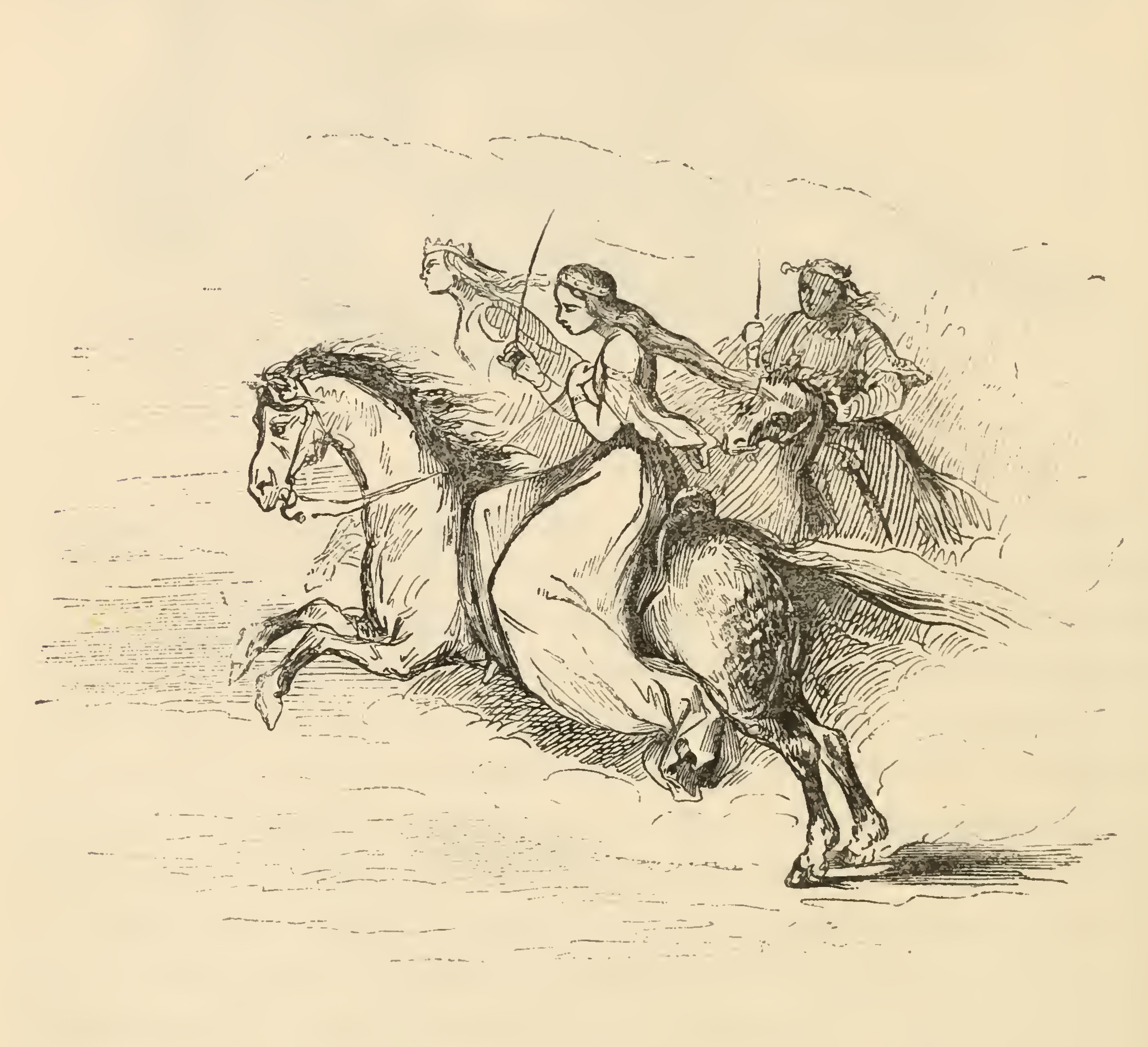 Seeking a story to tell Don Quixote, Sancho espies three women riding from Toboso on donkeys and returning to Quixote claims that he saw Dulcinea and her damsels riding from the city on powerful horses with crowns of diamonds, rubies, and cloth of tissue 5 feet long. In their hands they hold whips to spur the horses forward.