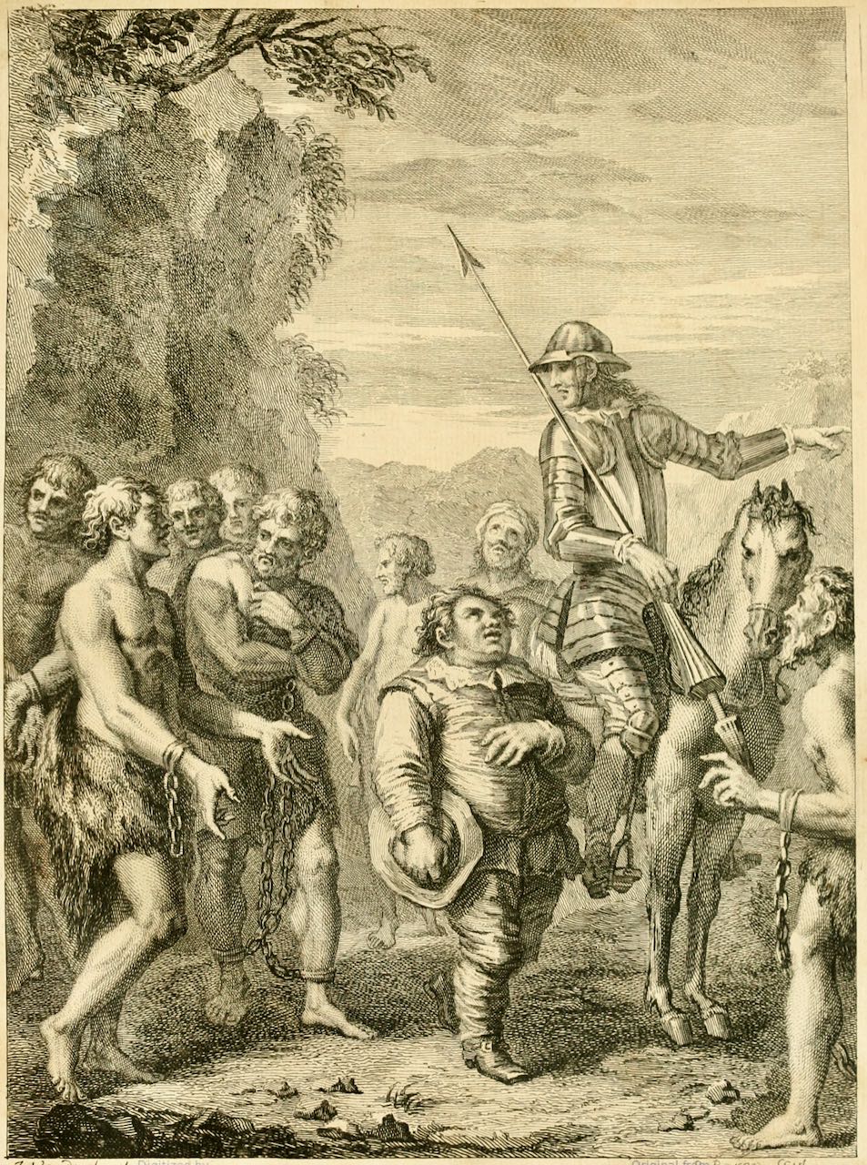 The liberated galley slaves gather around Don Quixote, who instructs them to present themselves to the lady Dulcinea. The dialogue between Don Quixote and Gines de Passamonte, one of the slaves, is captured by the hand gestures of the two figures. Plate no. 15, signed by J. Vanderbank (illustrator) and B. Baron (engraver). Vol. 1, book 3, ch. 8.