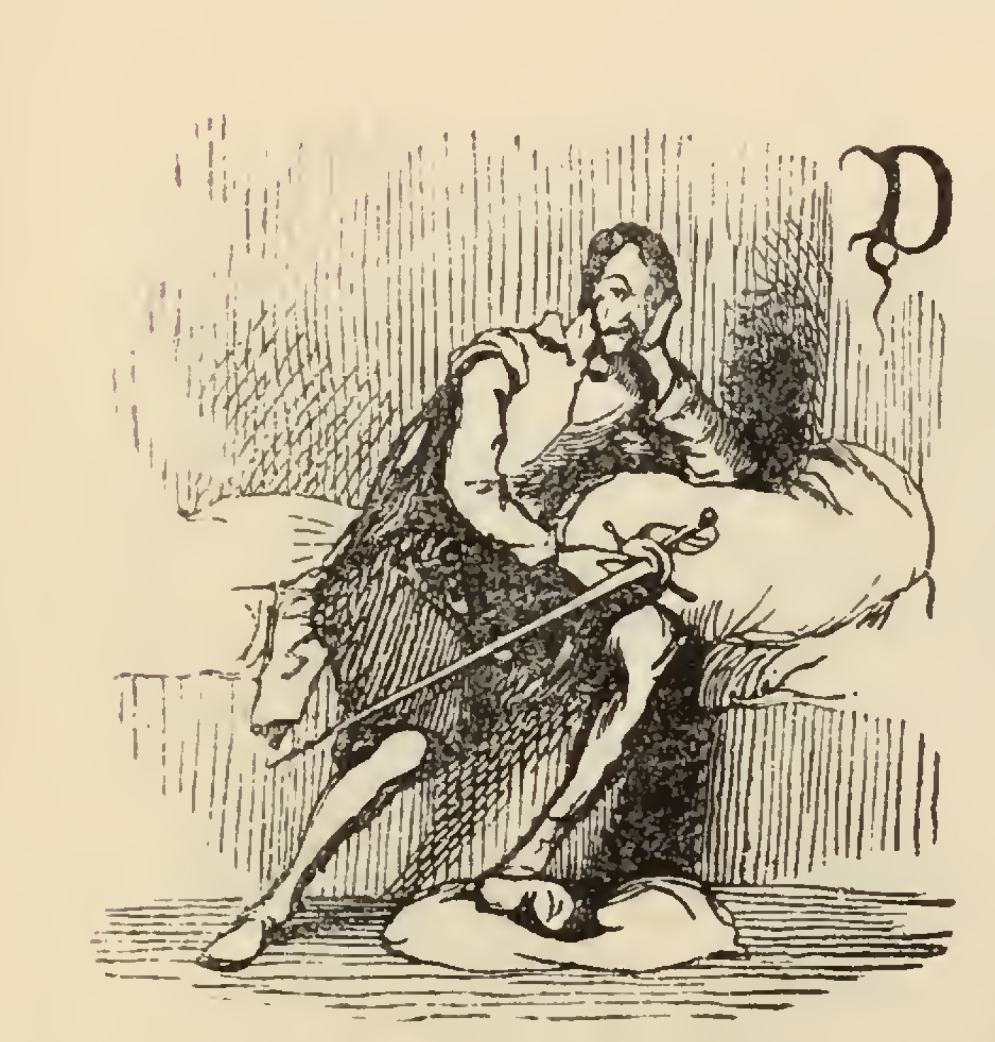 - Don Quixote, sits on his bed in a very pensive mood, a sword on his lap, his left foot resting on a pillow. The image is occasioned by Don Quixote waiting for the bachelor Sampson Carrasco.