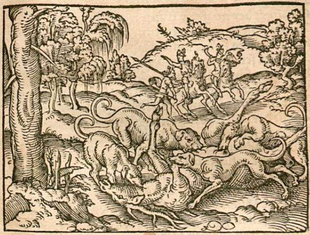 This engraving illustrates Actaeon in a transformed state of a stag being attacked by his own hunting hounds. Actaeon was transformed into a stag for gazing upon the goddess Diana whilst she was bathing. Actaeon was unable to command his hounds to stop due to his transformed state. The background of the engraving illustrates a group of soldiers riding on horses looking onto the scene of the dogs. These are the companions of Actaeon, and they are exploring the lands searching for him, unaware that he has been transformed and unaware that the hounds are killing him.