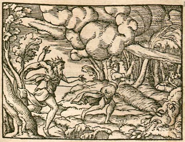 Jupiter is illustrated on the left side of this engraving. He is depicted wearing a crown to signify that he is the king of the gods. The woman that he is chasing is Io, daughter of the river god Inachus. Io was walking through the woods trying to find her way home when Jupiter approached her. When Io declined Jupiter’s approaches, Jupiter created a foggy mist to veil her vision, which is illustrated above Io in the engraving. When Jupiter finally caught up to Io, he raped her.