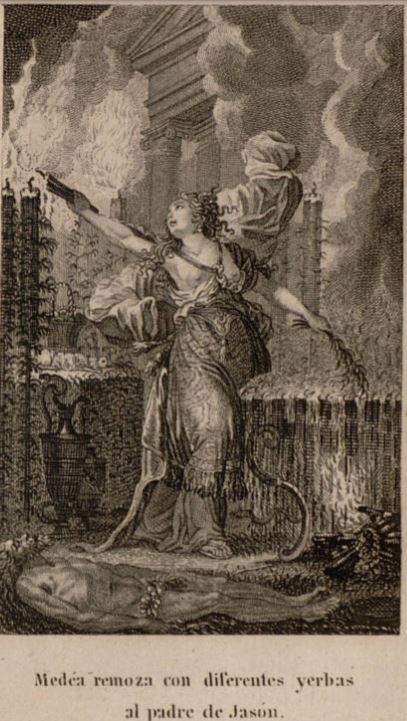 This image depicts Medea performing magic with various herbs in order to rejuvenate her father-in-law Aeson. Aeson’s body is lying on the ground as Medea lights candles and holds an olive branch. Medea must slit the throat of Aeson and drain his blood so that she can replace it with her potion. Once this is done, Aeson is rejuvenated by forty years.