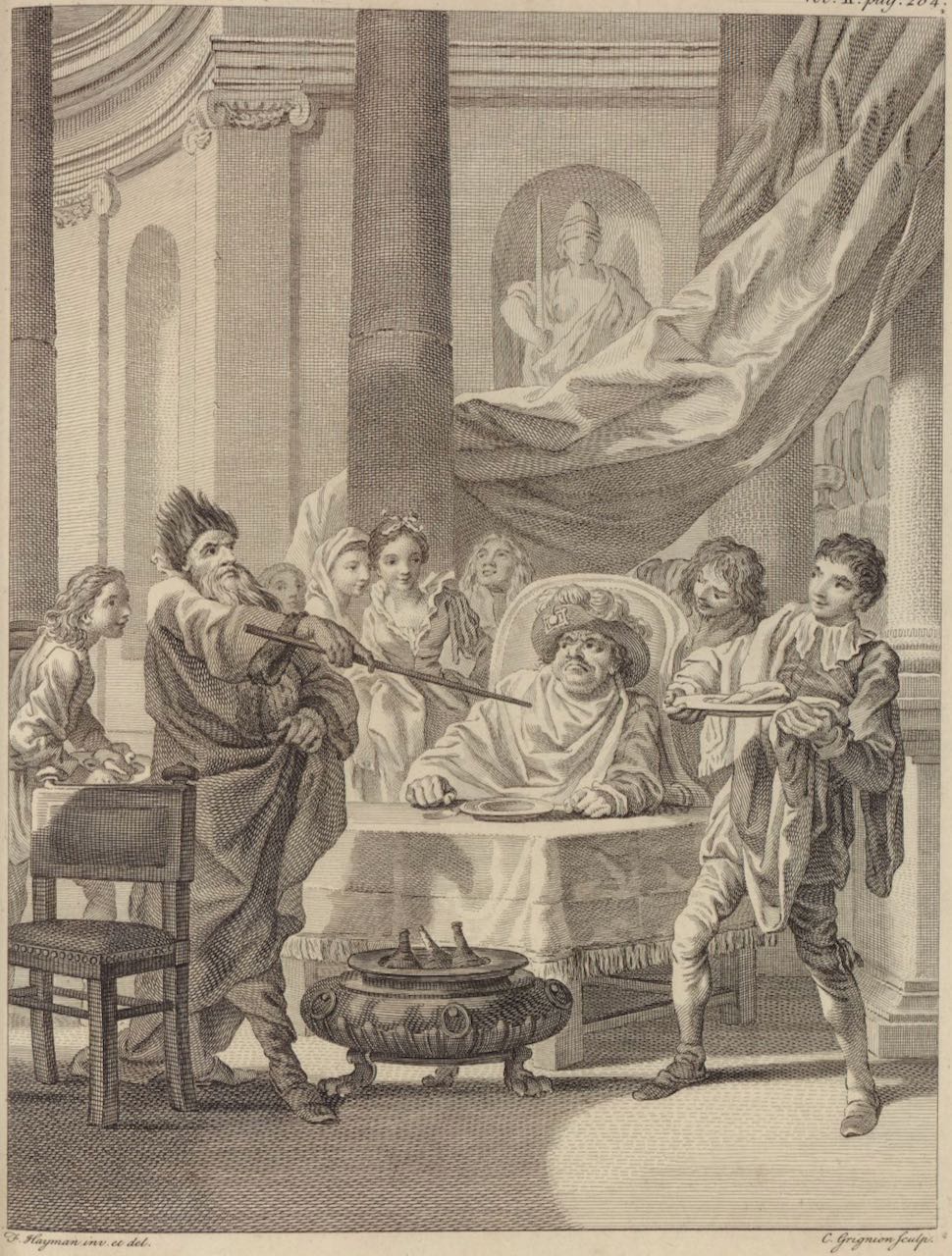 Sancho Panza is taken from the courtroom to a sumptuous palace, where, in a large hall, a royal table is set. Plates of food are placed before Sancho, but at the request of the physician Pedro Recio (right, holding a rod), they are taken away. Signed by F. Hayman (illustrator) and C. Grignion I (engraver). Part 2, ch. 47.