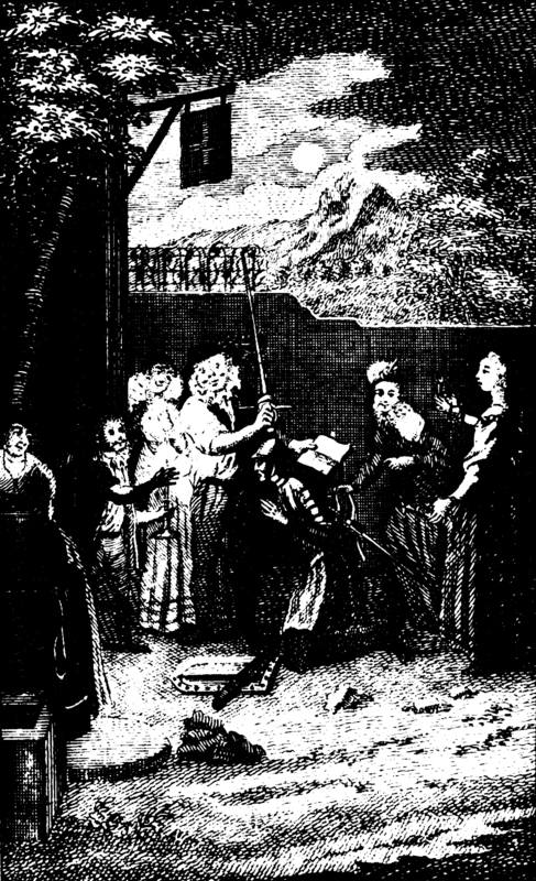 In the backyard of an inn in the plains of la Mancha, an innkeeper proceeds to bestow knighthood upon Don Quixote. Don Quixote has asked the innkeeper to give him this honour, as he mistaken the inn for a castle and the innkeeper for a king. Doubting the mental fluency of Don Quixote, the innkeeper goes along with Quixote's ruse so that the knight will leave without need of the law. For the knighthood ceremony, the innkeeper brought a sword to knight Quixote with and an accounts ledger to play the part of a script. In addition, the innkeeper gave a candle to a young boy to add ambience, and had to his left two women whom Don Quixote had mistaken for the queen and the princess. As the ceremony progressed the guests of the inn watched on in amusement.