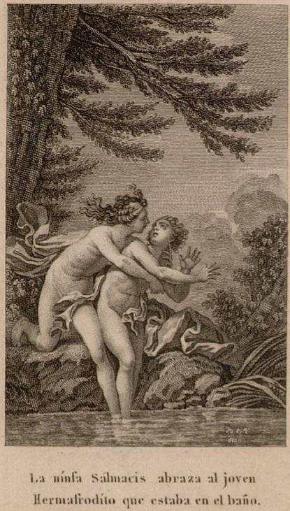This image depicts the story of Hermaphroditus and Salmacis. Salmacis is a water nymph that occupies a pool of fresh water and falls in love with Hermaphroditus when he finds her pool. Hermaphroditus is the son of Mercury and Venus, and the beauty of his appearance captivates the Naiad. She is overcome with passion and cannot restrain herself from pursuing Hermaphroditus, despite his rejections. Salmacis, with her arms thrown around Hermaphroditus, asks the gods to never be separated from him. The gods oblige, and merge their two bodies together, creating the first hermaphrodite.