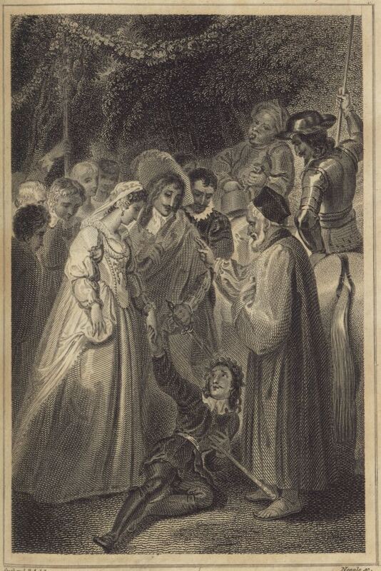 Basilio, pretending to have stabbed himself, is married to Quiteria. Don Quixote, Sancho Panza, Camacho (standing behind Quiteria), and the priest (standing, right) are also pictured. Signed by T. Stothard (illustrator) and J. Neagle (engraver). Part 2, ch. 21.
