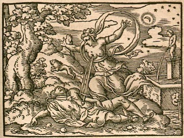 This engraving illustrates the story of Pyramus and Thisbe, two star-crossed lovers who share a tragic fate. Pyramus is illustrated lying dead on the ground of the forest, as he had just stabbed himself to death. He had done this because he saw a lioness in the location where he was meant to meet with Thisbe (the lioness is illustrated in the background of the engraving). He thought the lioness must have killed her. Grieved at the thought of Thisbe’s death, Pyramus kills himself. Thisbe, however, was not dead. She had hidden from the lioness in a cave, and when the lioness had run off, Thisbe emerges to see the body of her beloved Pyramus. Pained by the death of Pyramus, she takes his sword and impales herself, as illustrated in the image. The blood from their wounds spilled onto the berries on the tree behind them, which from that point on are known as blackberries.