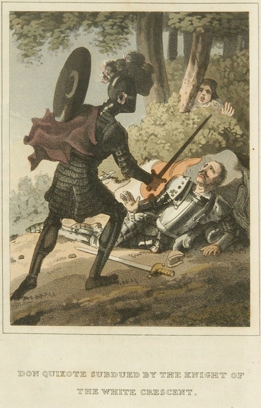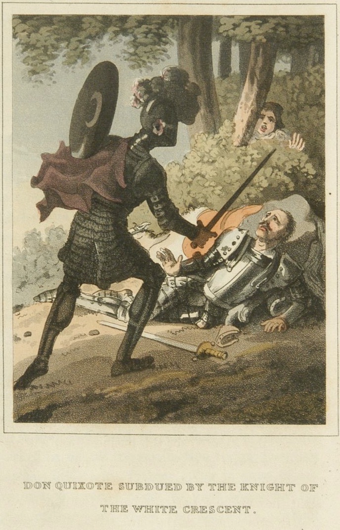 The Knight of the White Moon (Sansón Carrasco) defeats Don Quixote. The illustration is not accurate to the text: they are depicted in a forest, while Cervantes writes that the battle takes place on the beach at Barcelona. Sancho Panza is pictured in the background, hiding behind a bush. Unsigned. Part 1, ch. 3.