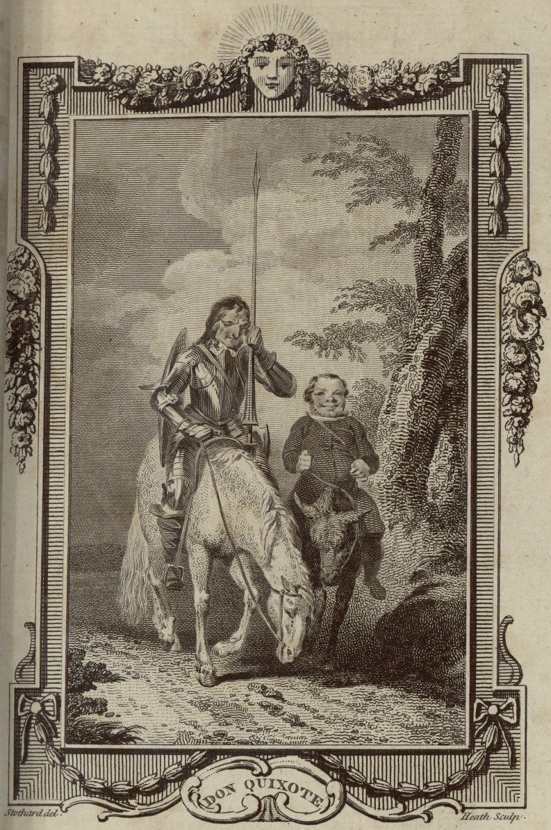 Don Quixote undertakes his second sally, now accompanied by his squire Sancho Panza. Don Quixote rides Rocinante, wearing his armour and holding his buckler and lance. Sancho is mounted on his donkey. Signed by T. Stothard (illustrator) and J. Heath (engraver). Plate III. Part 1, ch. 8.