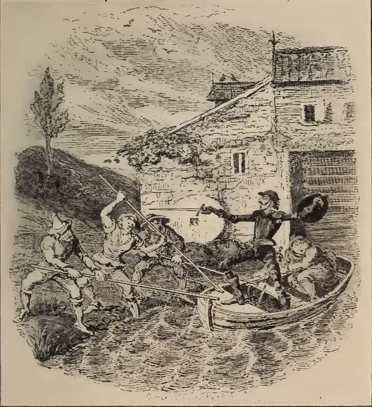Having boarded an empty boat up-river, Don Quixote and Sancho Panza ride this 'enchanted bark' downstream. Eventually they reach a mill, which Quixote confuses for a fortress, and its millers as evil enchanters. Worried that the boat could break their mill, the millers brought out long poles in order to stop the boat and those in it from experiencing an unsavory demise. As the millers stop the boat Don Quixote tries in vain to fend off the millers with his sword, while Sancho Panza tries in vain to hold on to the violently shaking vessel.
