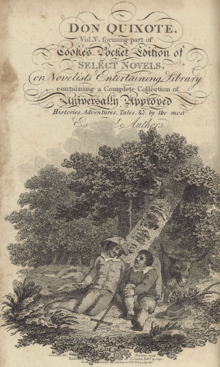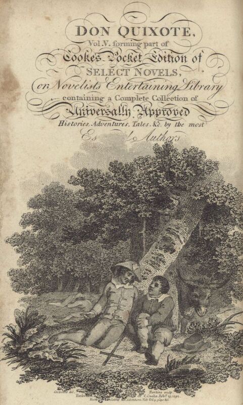 Vignette on title page. After leaving Barataria Island, Sancho Panza encounters Ricote, a shopkeeper from his village. While his fellow pilgrims sleep in a grove of poplars (background), Ricote tells Sancho about what happened to him after he left his village. Signed by R. Corbould (illustrator) and W. Hawkins (engraver), dated 1797. Part 2, ch. 54.
