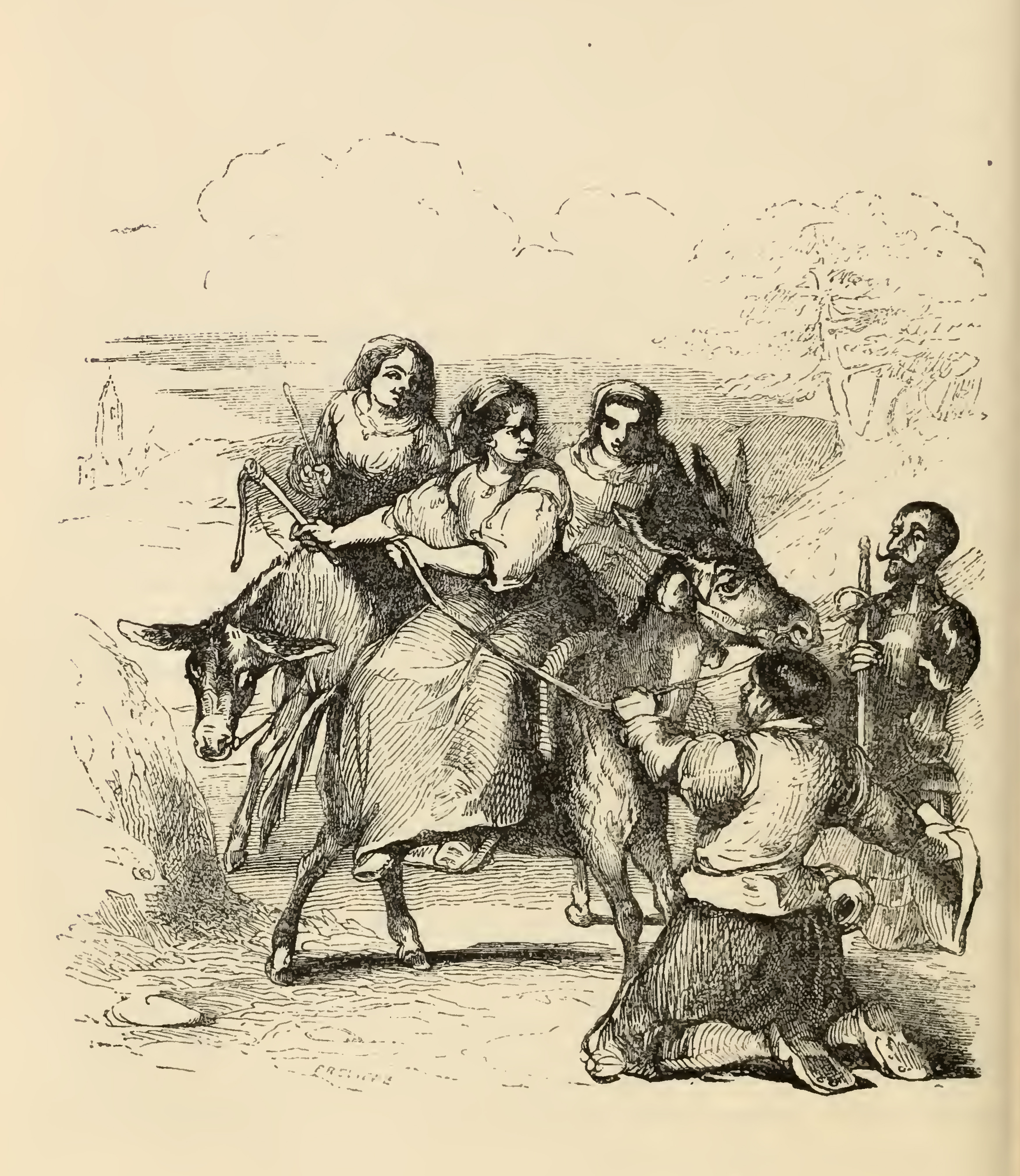 Sancho Panza meets the country girls and lays hold of one of them by the halter of their donkey, and bending to both of his knees introduces himself and his master to the girl who he calls Dulcinea Del Toboso. Seeing Sancho act thusly, Don Quixote (right) clad in armor, also places himself on his knees looking wistfully at the girl who Sancho Panza claims is Dulcinea Del Toboso. The two girls in the background laugh at the notion of being called ladies, and the girl in the front pulls back her halter angrily trying to distance herself from Sancho and Quixote. Toboso can be seen in the background on the left.