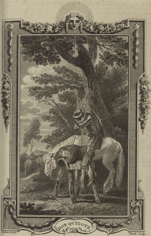 During the night in Sierra Morena, Ginés de Pasamonte (background) makes away with Sancho Panza’s donkey. In the foreground, Sancho Panza is pictured sleeping on the packsaddle propped up with stakes, and Don Quixote on Rocinante. Signed by T. Stothard (illustrator) and J. Heath (engraver). Plate XI. Part 1, ch. 23.