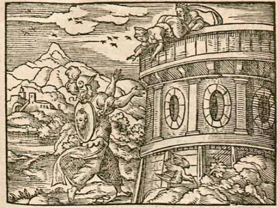 This engraving illustrates Daedalus on top of a tower, with his sister Perdix standing beside him, leaning over the ledge with her arm outstretched to her son who had just been pushed from the tower. Perdix had sent her twelve-year-old son, Talos, to live with Daedalus. Talos was incredibly bright and invented many things which caused Daedalus to become jealous. His jealously drove him to push Talos off the tower to kill him. Minerva, who favours intelligence, interferes and saves Talos before he hits the ground by transforming him into a partridge. Minerva is depicted standing on the ground at the bottom of the tower with her arms stretched out to signify that she had just transformed Talos into a bird. Talos then changes his name to Perdix to honour his mother and his new form.