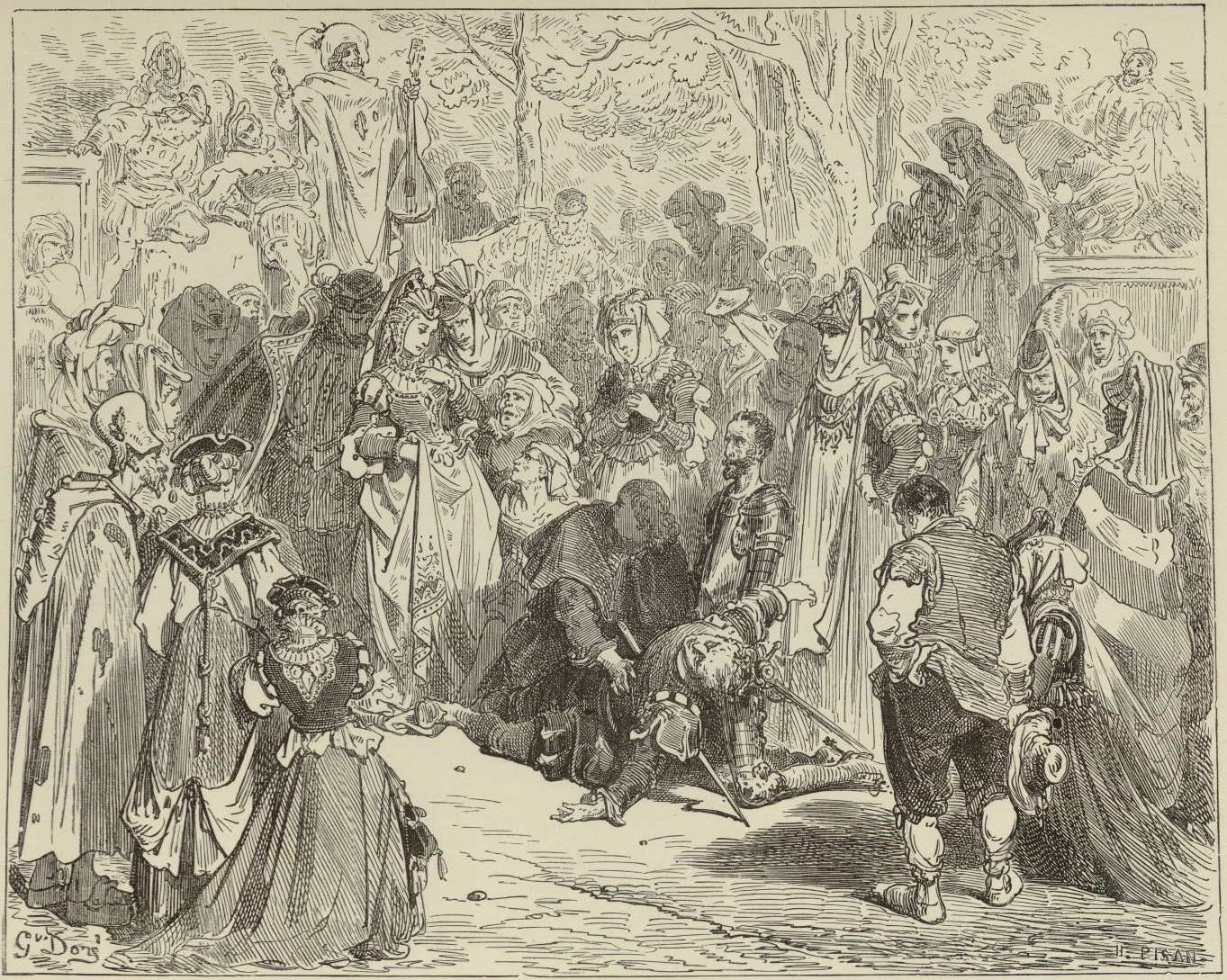 Basilio, pretending to have stabbed himself, is married to Quiteria. Don Quixote, Sancho Panza, Camacho (standing behind Quiteria), and the priest (holding Basilio’s body) are also pictured. Signed by G. Doré (illustrator) and H.-J. Pisan (engraver). Part 2, ch. 21.