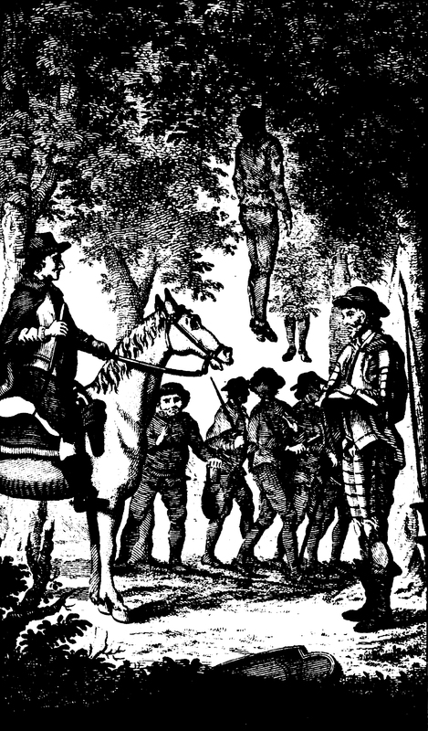 On the road to Barcelona, Sancho Panza (pictured in the background to the left) and Don Quixote pass through a forest of hanged robbers. To their surprise they are suddenly surrounded by forty live robbers who hold them at knife-point, rummage through their belongings for valuable, and in the Catalonian tongue ordered them not to move till their captain arrives. Their captain arrived soon thereafter (pictured to the left upon a horse), his name was Roque Guinart, and seemed to be about thirty four years old, of a robust make, middling size, reserved, and brown in complexion. He was mounted upon a horse, was clad in a coat of mail, and armed with multiple pistols. Upon arriving, Roque was most surprised by the amusingly melancholic figure of Don Quixote clad in full armor (pictured to the right discussing his mission to Roque), and sought to understand the full extent of his madness which he was so famous for. Beneath the image is inscribed the message "On foot and deep in thought, behold our knight surprised by robbers - unprepared for fight, who plunder Dapple, but the things restored pleased much Sancho - and his master more".