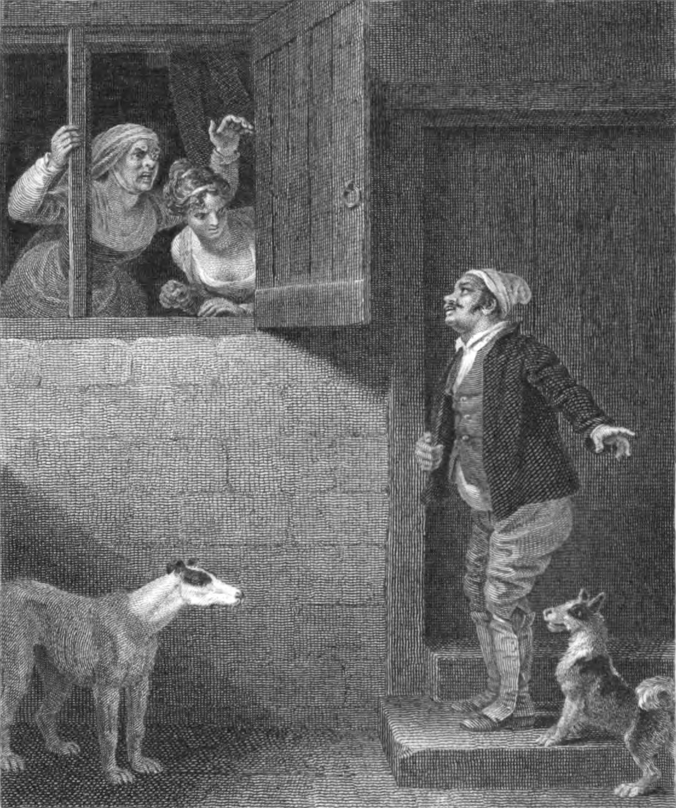 Sancho Panza stands at the doorstep of Don Quixote's house, addressing Quixote's niece (right) and housekeeper (left) who lean through the window to speak to him. At Sancho's feet, two dogs investigate the alleged intruder.