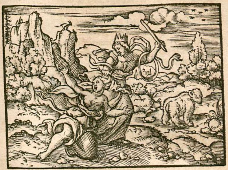 This image depicts Juno, the wife of Jupiter, pulling on the hair of the nymph Callisto. Juno is depicted with a crown to signify her status as a goddess as well as the wife of the king of the gods. Juno is angry with Callisto because Jupiter had raped her and then she gave birth to a son. This was an embarrassment to Juno, so she decided to punish her. Juno physically transformed her into a bear with her human consciousness remaining. Callisto, in the form of a bear, is illustrated on the right side of the image.
