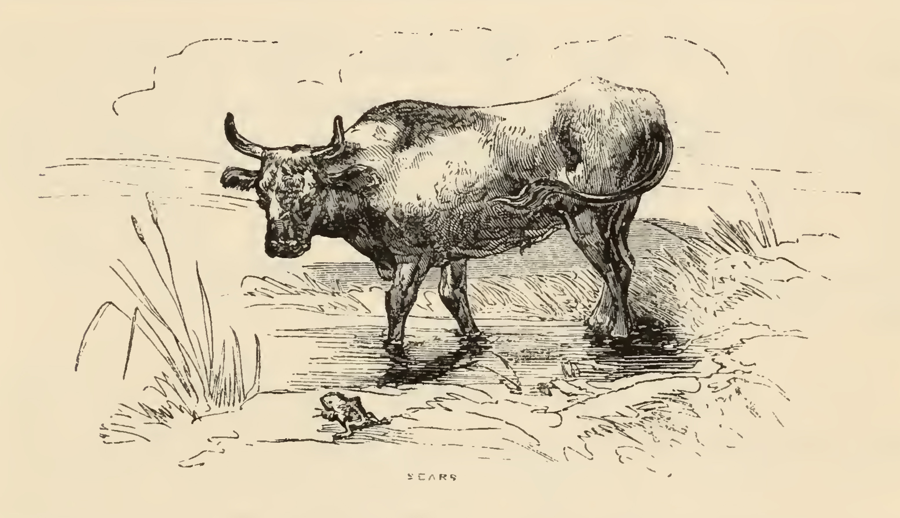An ox stands in the midst of a small stream and looks towards the shore in the foreground where a single frog stands by a patch of reeds. The image is occasioned by the duke telling Sancho Panza "Secondly, Bear constantly in mind who you were, and endeavour to know yourself, which is the most difficult point of knowledge imaginable. The knowledge of yourself will keep you from puffing yourself up, like the frog who strove to equal the ox in size" (Page 447).
