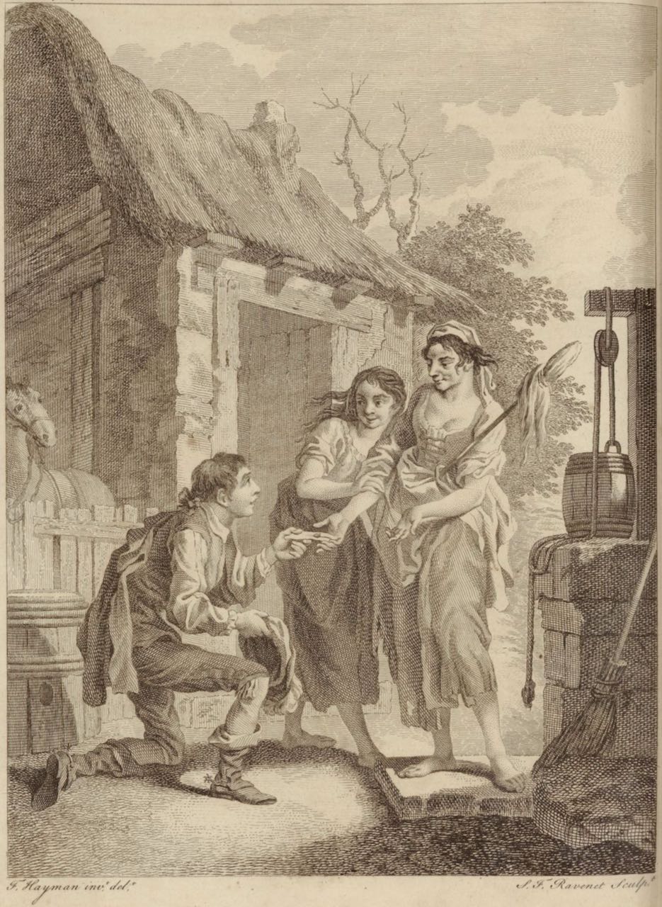 The duchess’ page kneels before Teresa Panza and her daughter Sanchica. He presents them with letters and gifts from the duchess and Sancho Panza. Teresa holds a bunch of flax (accurate to the text). Teresa’s thatched-roof house and well are depicted. Signed by F. Hayman (illustrator) and S. F. Ravenet (engraver). Part 2, ch. 50.