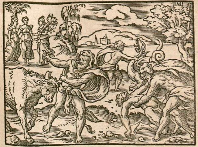 This engraving illustrates the wrestling match between Hercules and the river god, Achelous. Hercules and Achelous were both interested in marrying a woman named Deianira, and this caused a rivalry between the two. Hercules believed he should marry her because he is the son of Zeus. Achelous believed he should marry her because he was a native to that land and not a foreigner, like Hercules. Hercules and Achelous began to physically fight for the right to marry Deianira. There are three fighting scenes in the engraving, one where Achelous is in his human form, one where he transforms into a serpent, and one where is in the form of a bull. When Achelous transforms into a bull, Hercules rips off one of his horns and wins the battle. There are three women illustrated in the background of the engraving, one of them is assumed to be Deianira.