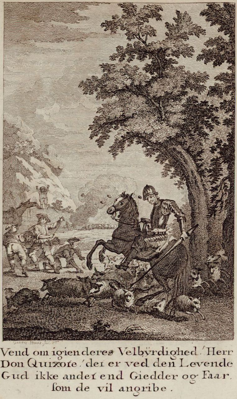 Vend om igien deres Velbÿrdighed! Herr Don Quixote! det er ved den Levende Gud ikke andet end Giedder og Faar fom de vil angribe