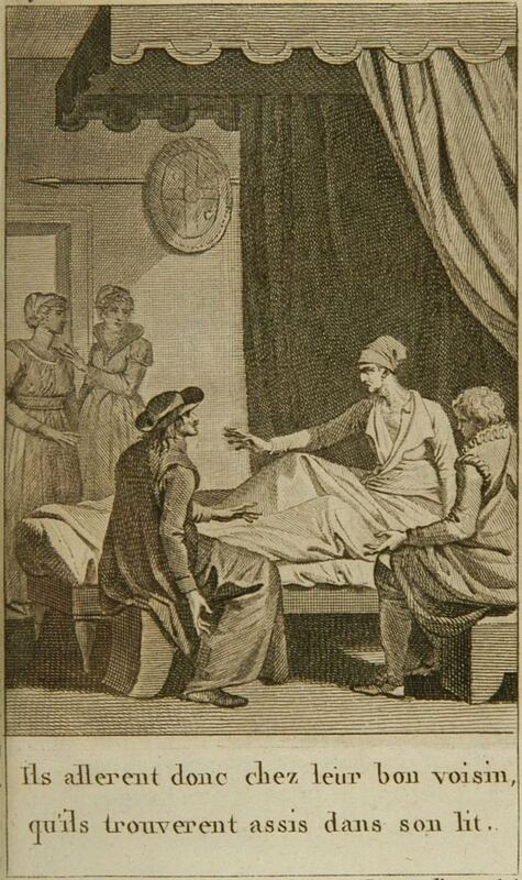 Ils allerent donc chez leur bon voisin, qu'ils trouverent assis dans son lit