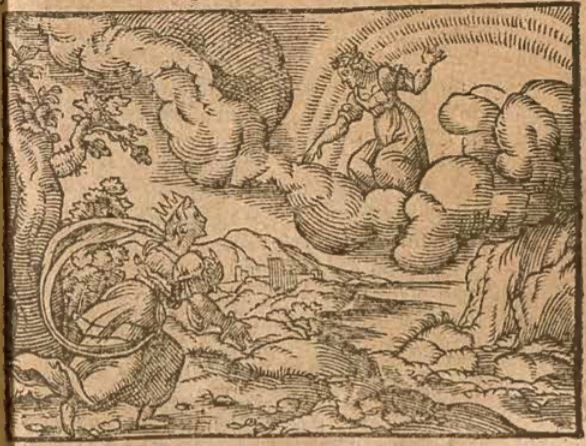 Hersilia, the wife of Romulus, is depicted on the left-hand side of the engraving with a crown on her head, running towards the goddess illustrated in the sky. Hersilia, as described by Ovid, had been upset as Romulus had been deified and had to leave her behind. The goddess Juno had pitied Hersilia, and sent her messenger, Iris, to send word to Hersilia that she may join her husband and become a goddess herself. Iris is illustrated on the cloud with her hand reaching down towards Hersilia.