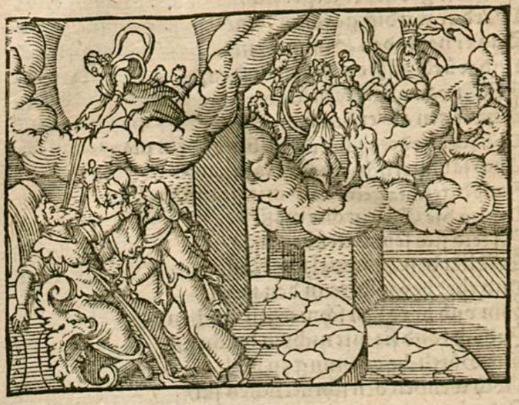 The top right corner of the engraving illustrates many gods sitting on a cloud looking at Jupiter who is wearing a crown and holding thunder bolts. Venus begs Jupiter to stop the assassination of Julius Caesar before it happens. Jupiter, however, explains that there is nothing Venus can do to stop the fates from ending Caesar’s life. The left side of the engraving depicts the assassination of Julius Caesar. Venus is illustrated in a cloud above Caesar with her hands reaching towards him as she transforms him into a star and deifies him once he is dead. Cupid, Venus’ winged son, is depicted directly behind her on the cloud.