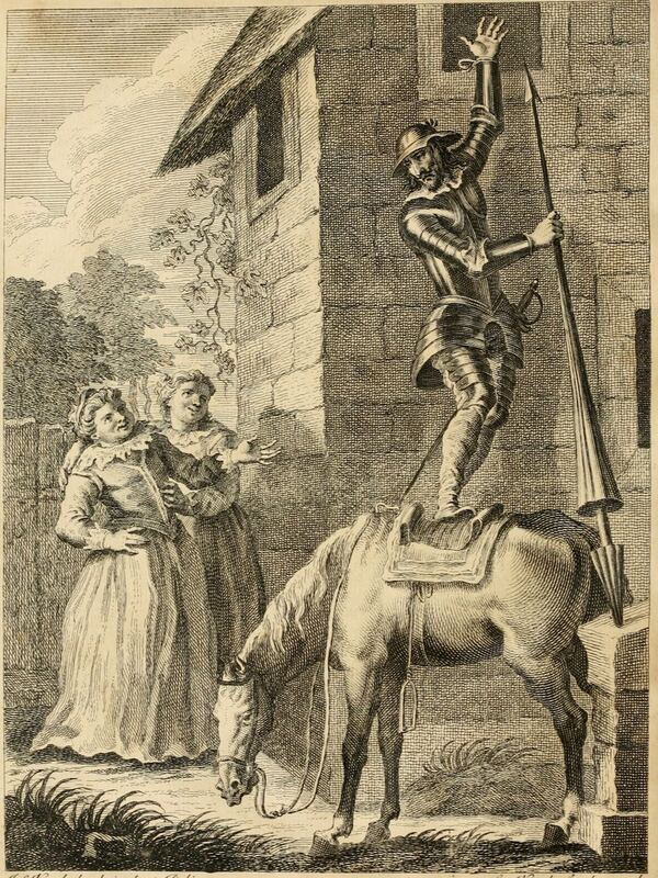 Don Quixote, hung by his hand tied to the window of the inn, stands on Rocinante while Maritornes and the innkeeper’s daughter observe him from the courtyard. The illustration is not an accurate representation: in the text, Maritornes and the innkeeper’s daughter watch from the window before leaving him. Plate no. 24, signed by J. Vanderbank (illustrator) and G. van der Gucht (engraver). Vol. 1, book 4, ch. 16.