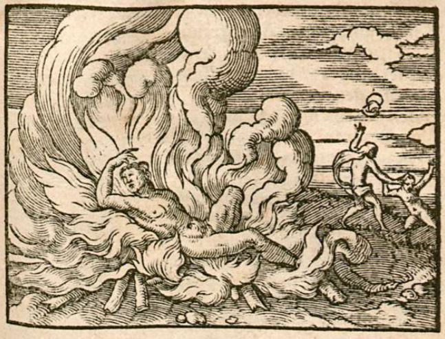 When Hercules had shot the centaur Nessus with a poisoned arrow, Nessus gave his blood-stained shirt to Hercules’ wife, Deianira. Nessus told Deianira that the shirt would act as an aphrodisiac if Hercules were to ever become unfaithful to her. The time came when Deianira was questioning Hercules’ fidelity to her, so she gifted him the shirt of Nessus. The shirt, however, was not an aphrodisiac. The shirt burst into flames when Hercules put the shirt on, and there was nothing he could do to stop it. In the background of the engraving, Hercules is illustrated throwing a man named Lichas into the water out of anger and pain he was feeling. Hercules decided to accept his fate and he made himself a funeral pyre. He is illustrated in the forefront of the engraving laying on the pyre accepting his death.