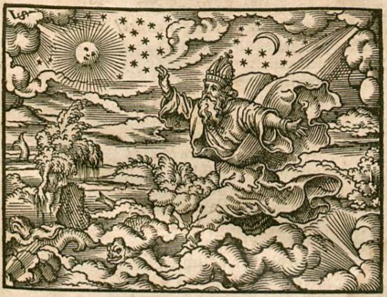 This illustration depicts a god of an unknown name, surrounded by disorder. Ovid describes that the origins of the world were chaotic, unorganized, and all things were unstable. The image shows a god fixing the chaos and separating all the elements into stability. His right hand appears to be creating separation between day and night, where the sun is on the left top side of the image, and the moon on the right, with clouds in between them. The rest of the image is difficult to interpret which symbolizes the chaos in which Ovid describes.