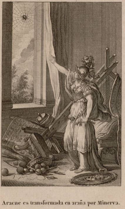 This image depicts the goddess Minerva transforming Arachne, a skilled weaver, into a spider. Arachne is depicted in the top left corner in her transformed state as a spider sitting in a web. There is a loom knocked over behind Minerva. Arachne had claimed she was a better weaver and spinner than the goddess Minerva. Minerva, angered by this hubris, challenged Arachne to a weaving contest. After Minerva had won the contest, she transformed Arachne into the spider as a punishment.