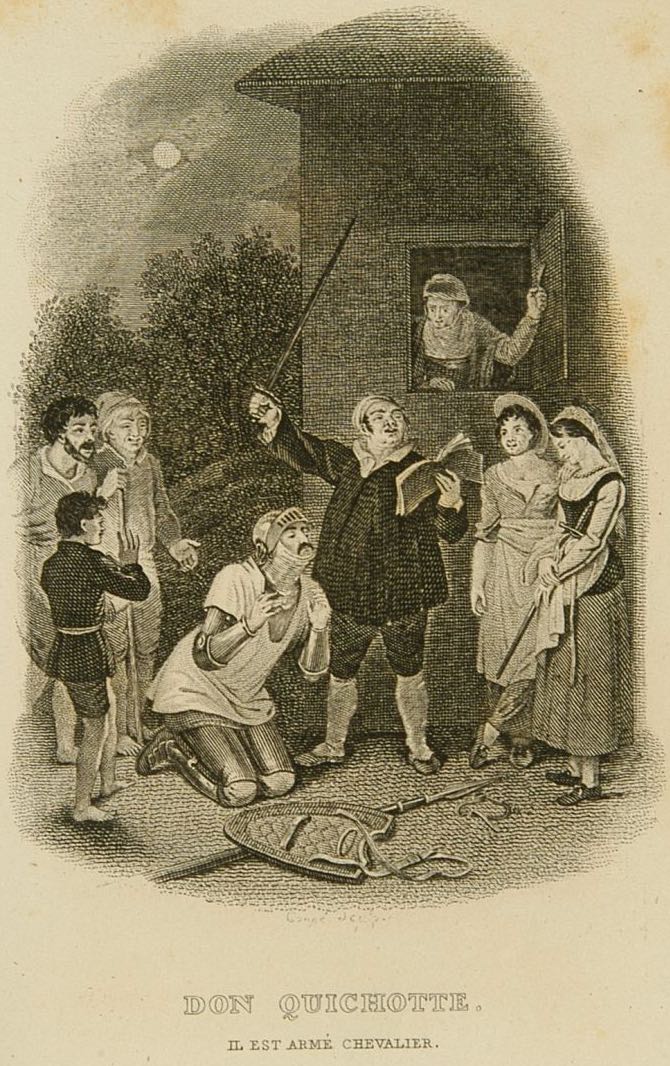 Don Quixote, kneeling and wearing his helmet, is knighted by the innkeeper, who holds a sword and a book. Doña Tolosa, holding Don Quixote’s sword, and Doña Molinera stand to the right. A crowd gathers to watch the spectacle, including a boy holding a candle to light the scene. Signed by A.-J.-B. Coupé (engraver). Part 1, ch. 3.