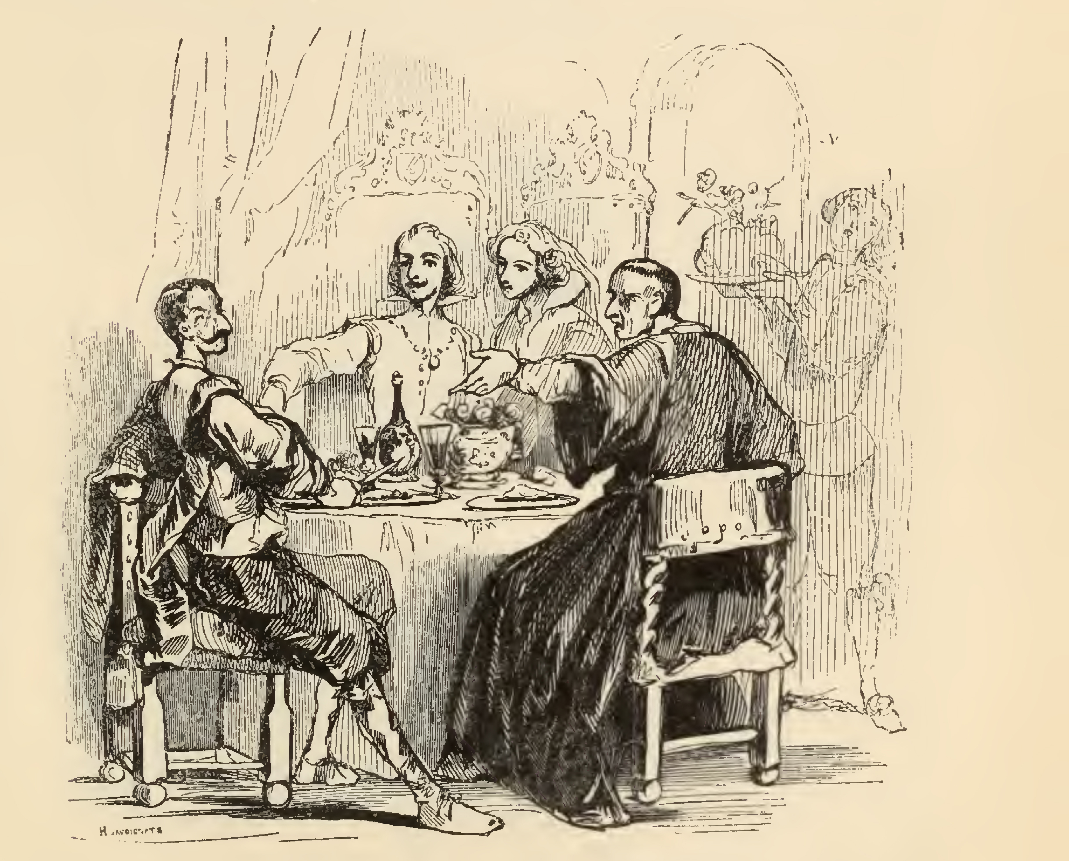 Don Quixote sits at the head of an extravagant table full of morsels and drink with his arms crossed and his legs splayed to his right displaying his patterned leggings. The ecclesiastic seated against him, dressed in religious robes, extends his left hand parallel to the ground in argumentation. The the duke and duchess are also seated on the other side of the table in very tall chairs. In the background on the right, a servant delivers a tray of food.