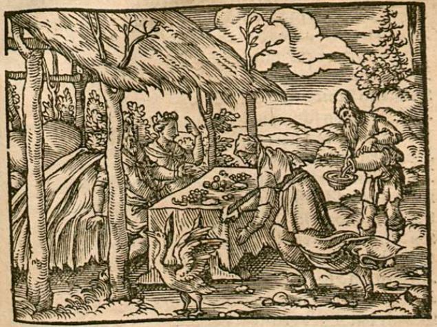 The gods Jupiter and Mercury had disguised themselves as weary travelers and sought hospitality from citizens in a town called Phrygia. Every house that they came upon denied their entry and failed to provide the gods with hospitality, until. an old, humble couple welcomed them graciously into their home. Their names were Baucis and Philemon, and they gave exceptional hospitality to the disguised gods, despite their lack of provisions. The gods are depicted sitting at their table in the engraving while Baucis and Philemon are illustrated pouring wine and setting the table for their guests. There is a goose illustrated in the engraving as well, as Baucis and Philemon were willing to sacrifice it in order to feed their guests. Before they could sacrifice the goose, Jupiter and Mercury revealed their true identities.