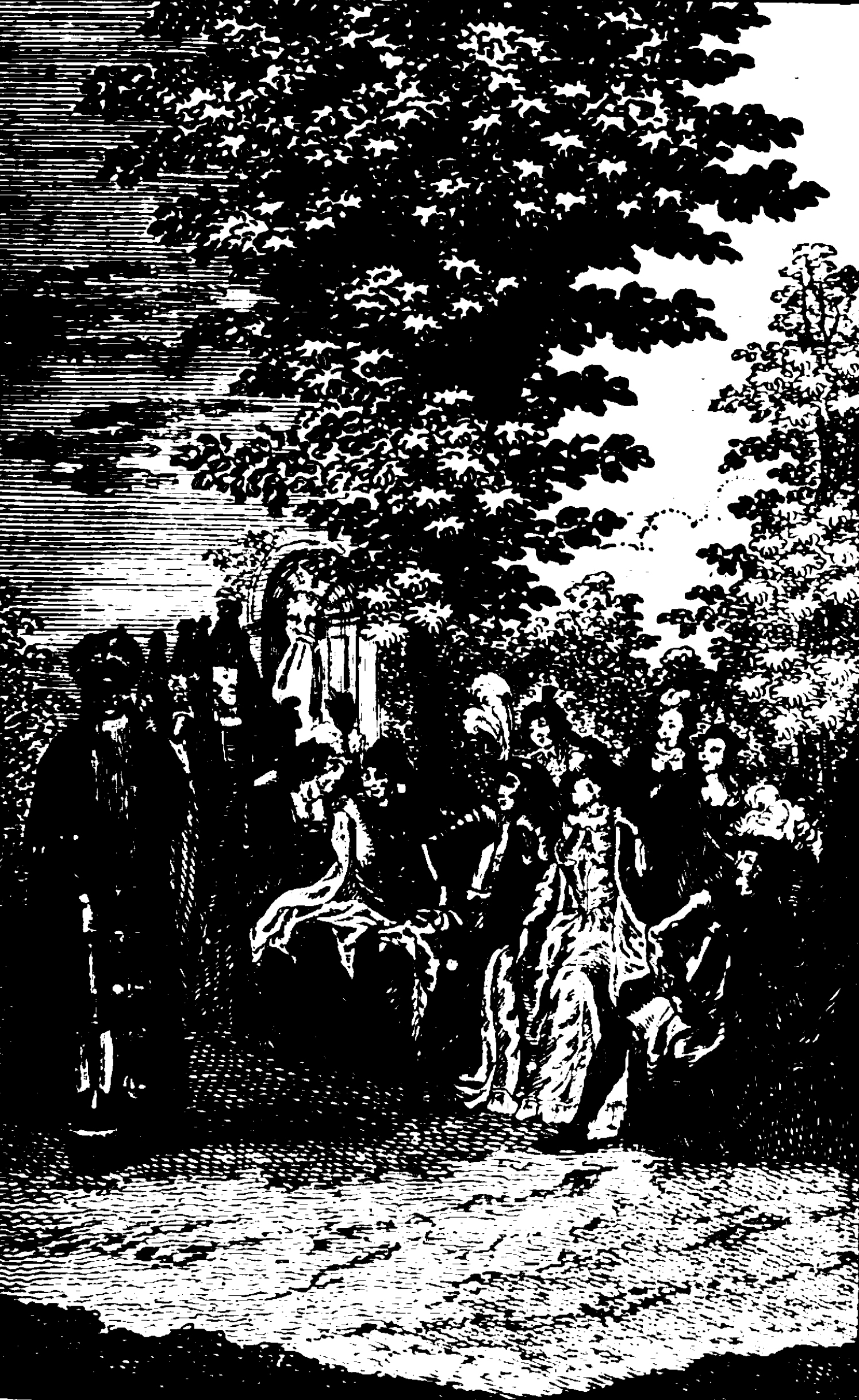 Twelve elderly women enter the garden of the Duke and Duchess, ranked in pairs, clad in large mourning habits over which they wore veils of white calicoe. They are the procession of Trifaldi, the countess of three skirts. Don Quixote (pictured to the right of the Duchess), the Duke (pictured to the left of the Duchess), and the Duchess (pictured in a white dress between Quixote and the Duke) all stood up in response to this procession. Then the twelve women ordered themselves into two rows and made a lane for the countess (pictured walking towards the Duke wearing to crown) to march between them.