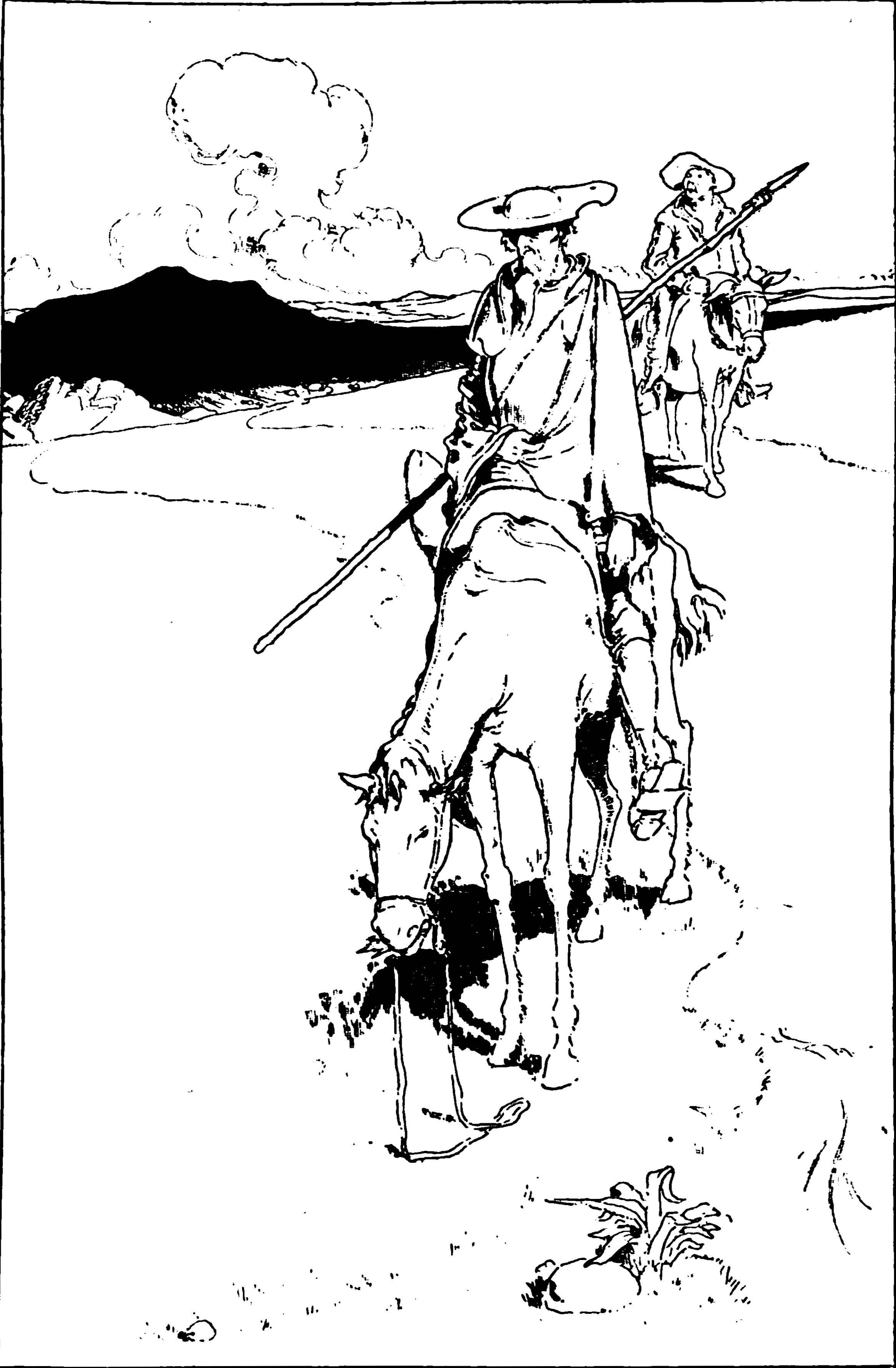 Having visited his lady Dulcinea of Toboso, Don Quixote and Sancho Panza mount their beasts and follow the road to Saragosa to partake in a solemn festival. As they travel Quixote (left) sits pensively on Rocinante, thinking about the trick which he thinks enchanters have played on him, fooling him into thinking a commoner was instead his lady Dulcinea, and how to reverse the ill enchantment. He becomes so engrossed in his thoughts that he lets go of Rocinante's bridle, allowing the horse to leave the path and follow its own whim.
