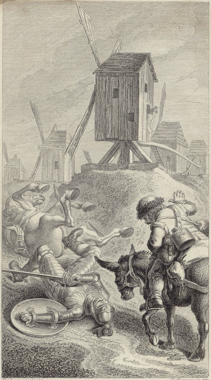 In the foreground, Sancho Panza comes to help Don Quixote and Rocinante, who were thrown by the windmill (background). Signed by D.-N. Chodowiecki (illustrator) and D. Berger (engraver), dated 1779. Plate 2. Part 1, ch. 8.