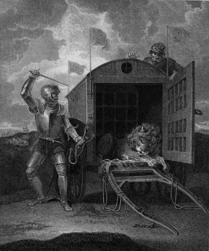 Don Quixote pulls aside a cart flying the flags of the king, and the cart driver explains they are carrying Lions to the King. Quixote, wishing to fight the lion, threatens the Keeper's life. The keeper, seeing Don Quixote fixed in his posture , knew he could not avoid letting loose the lion, without incurring the resentment Quixote's wrath, and opened the door of the cage, where the lion was lying. This lion was both very large and had on it a frightful and illustrious mane. Don Quixote, clad in full armor, observes the lion with fixed attention, his sword high in the air and his shield by his side, impatient to might grapple the lion defeat it. The lion takes no notice of Quixote's challenge and merely lies in the cage lazily.