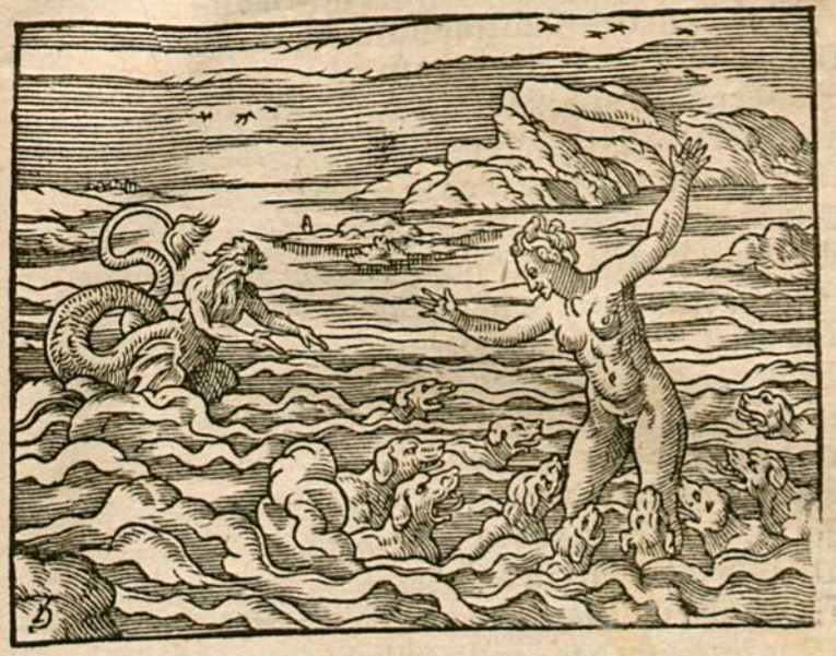 This image illustrates Scylla being transformed into a sea monster. Scylla was a beautiful young woman who had been sought out by many men. After being rejected by Scylla, the sea-god Glaucus was enraged. He had sought the help of Circe, a goddess skilled in herbs and potions, to help Scylla fall in love with him. Circe had become infatuated with Glaucus, and when he rejected her due to his affection for Scylla, Circe had become jealous as Glaucus preferred Scylla over her. To exact revenge, Circe concocted juices and herbs to transform Scylla into a monster. The engraving illustrates many hounds surrounding Scylla, who are now a part of her body. Glaucus is visible in the background of the engraving shocked at Scylla’s transformation.