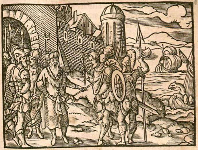 This engraving illustrates Cephalus, an ambassador of Athens and ally to Aegina, having just arrived on the shores of Aegina. Him and his companions are greeted by King Aeacus of Aegina and his sons Telamon, Peleus, and Phocus on the left side of the image. Cephalus arrived in Aegina to request their aid as King Minos of Crete was out of control and trying to wage war on Athens. In the background of the engraving, there is a ship that is sailing away from Aegina. This ship contains King Minos, as he had left Aegina only moments prior to Cephalus arriving, attempting to recruit King Aeacus into joining his forces. King Aeacus declined, as he was allied with Athens.