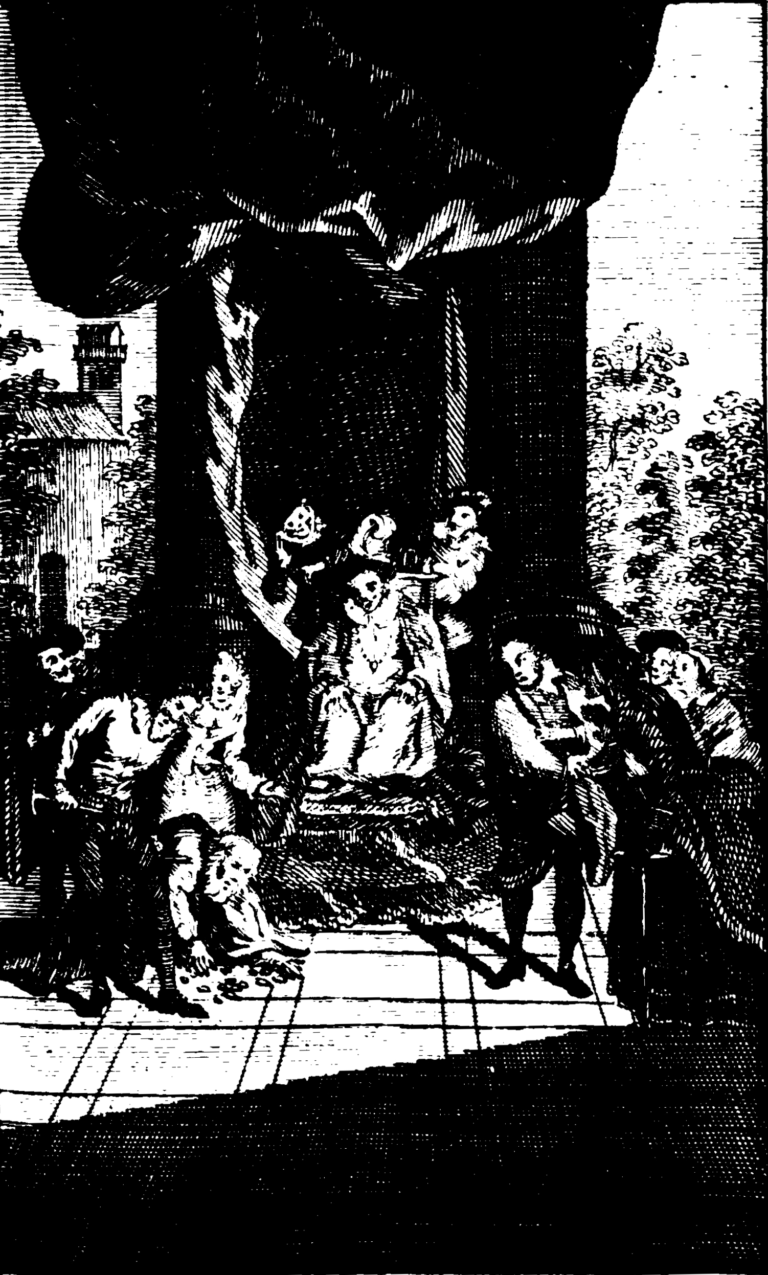 Having been carried to the court of justice, Sancho Panza is placed on a regal seat and told that it is custom for the governor of the islant to answer difficult and intricate questions asked of him by the citizens. The answers Sancho gives will make the people feel the extent of his wisdom, and estimate his abilities, so they can judge whether they ought to rejoice, or to be worry for his coming. The first to seek an audience with Sancho Panza are two old men (pictured to the left), one with a staff and the other without. The old man without a staff explains that he'd lent ten crowns but had not been repaid. The old man with the staff claimed he had never been lent the ten crowns to begin with. The old man without the staff said he would be satisfied if the other man would swear upon god that he has paid me back. The old man with the staff agreed and handed his staff to the plaintiff before swearing to Sancho and all present that he had repaid the sum in full. Satisfied, the plaintiff gave the staff back and was about to leave but Sancho stopped him and told his attendants to break the staff. The staff was then broken and ten crowns fell out from within.