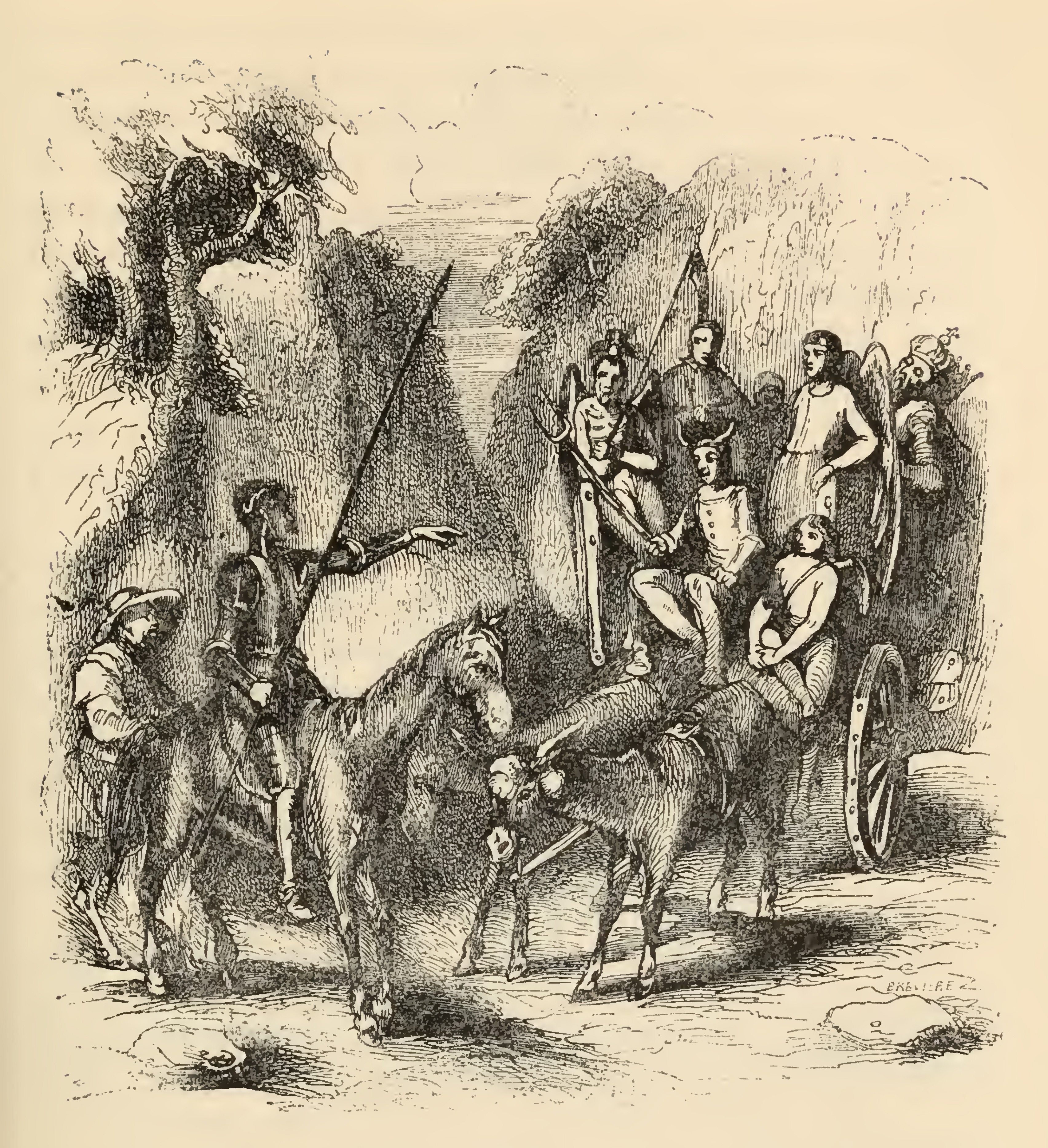 Don Quixote (left), clad in armor, and Sancho Panza (far left) come across a cart without awnings, strapped to two donkeys led by a man dressed as the devil. Sitting in the cart are a man dressed as death with scythe in hand, an angel with large painted wings, a man with a crown, and a man dressed as cupid with a bow slung over his shoulder. Quixote, mounted on Rocinante, holds his lance in his right hand and with his left points at their cart and asks what their business is.