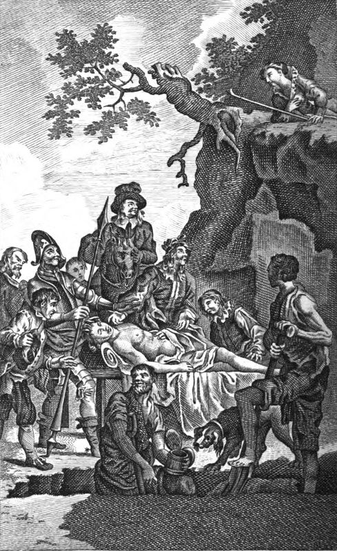 After Vivaldo (pictured riding a horse in the background) reads Chrysostom's song of despair as he is set to be buried, Ambrosio gives a eulogy for his shepherd friend, accusing Marcella of causing Chrysostum's death. Vivaldo sets about to read another of Chrysostom's songs but is interrupted by the sight of the shepherdess Marcela (pictured looking down at the burial from a rock), who appeared so beautiful it surpassed all report. Don Quixote (pictured clad in full armour with a lance by his side) was as shocked by her beauty as all other attendees.