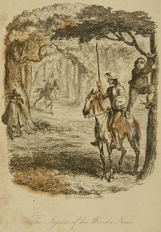 Sancho Panza, startled by the big nose of the Knight of the Mirrors’ squire (Tomé Cecial), climbs into a tree. Don Quixote and the Knight of the Mirrors (Sansón Carrasco) prepare to duel. Signed by G. Cruikshank (illustrator and engraver). Part 2, ch. 14.