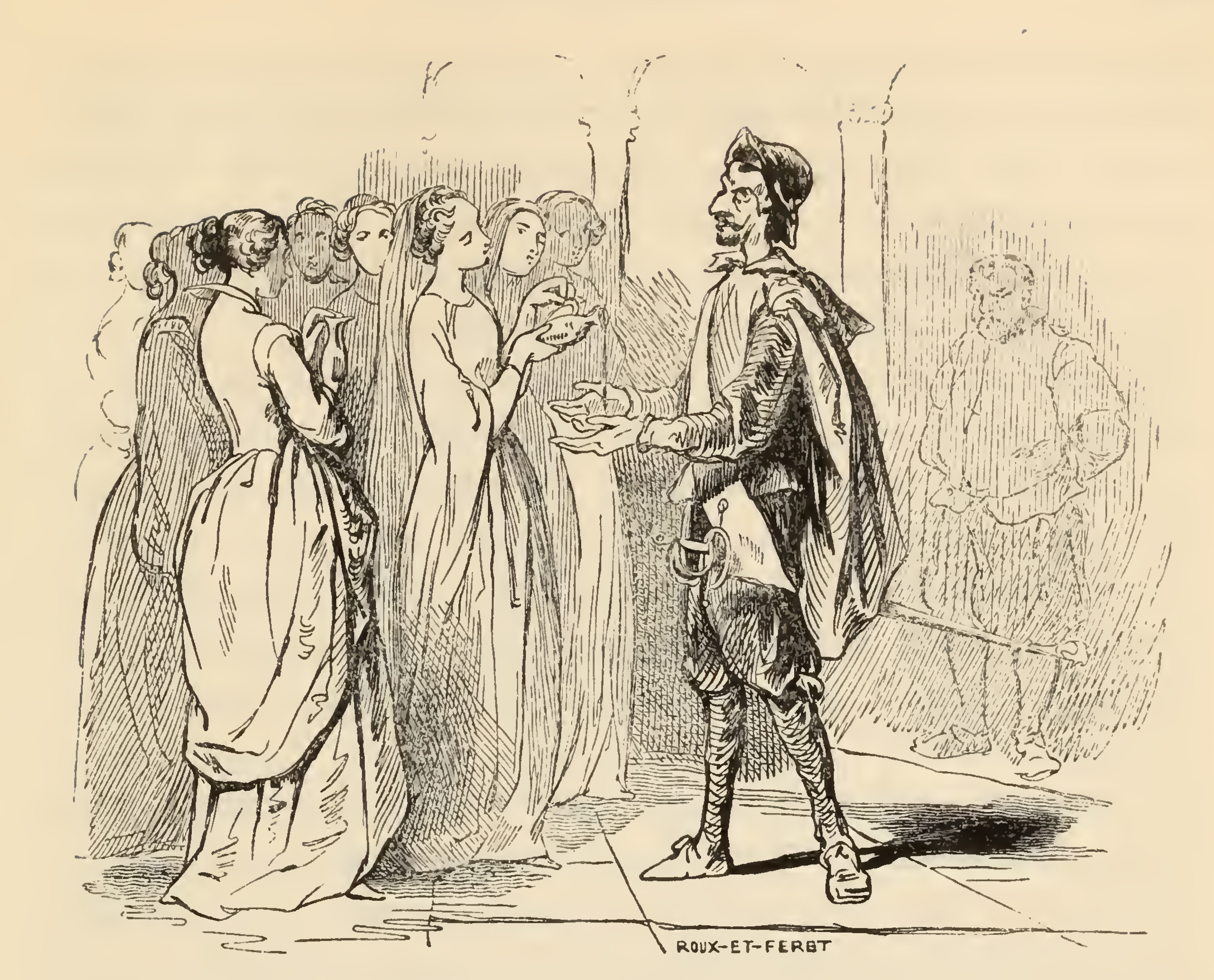 Don Quixote (middle) dressed with scarlet mantle over his shoulders and a satin montera marched out into the great saloon with his sword by his met. He is met by many damsels drawn up in two ranks, as many on one side as the other, and all of them provided him with flagons of perfumed water for washing his hands, which he accepts by offering his hands to one of the damsels who begins to pour her flagon. On the right Sancho Panza watches in the background.
