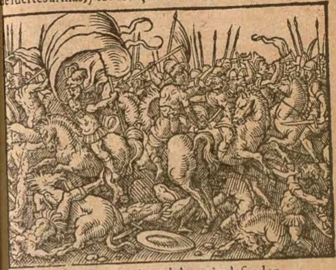 This engraving illustrates the pure chaos of the first battle between the Greeks and the Trojans. This battle signifies the beginning of the Trojan war, as it is the first encounter the two armies have with one another. Protesilaus is the first Greek to step onto the shores of Troy, as well as the first to die. He is most likely one of the men in the forefront of the engraving who are depicted to have been slain.