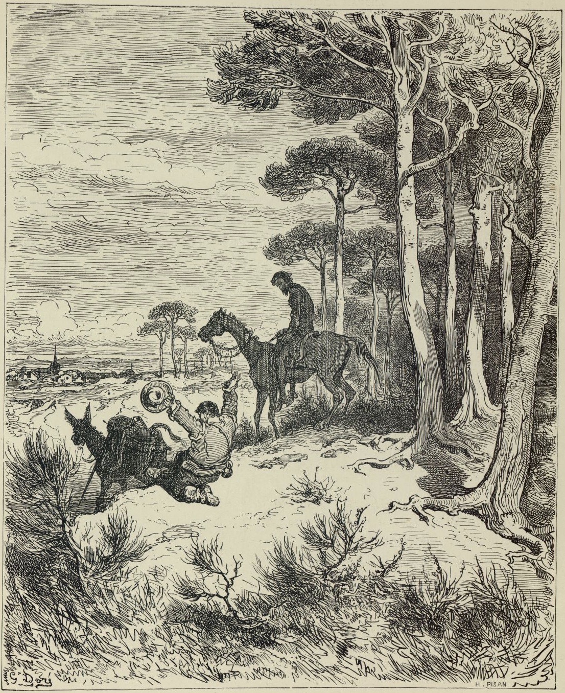In the foreground, Sancho Panza kneels before his village (background). Don Quixote, mounted on Rocinante, observes him. Sancho Panza’s donkey carries the knight’s armour. Signed by G. Doré (illustrator) and H.-J. Pisan (engraver). Part 2, ch. 72.