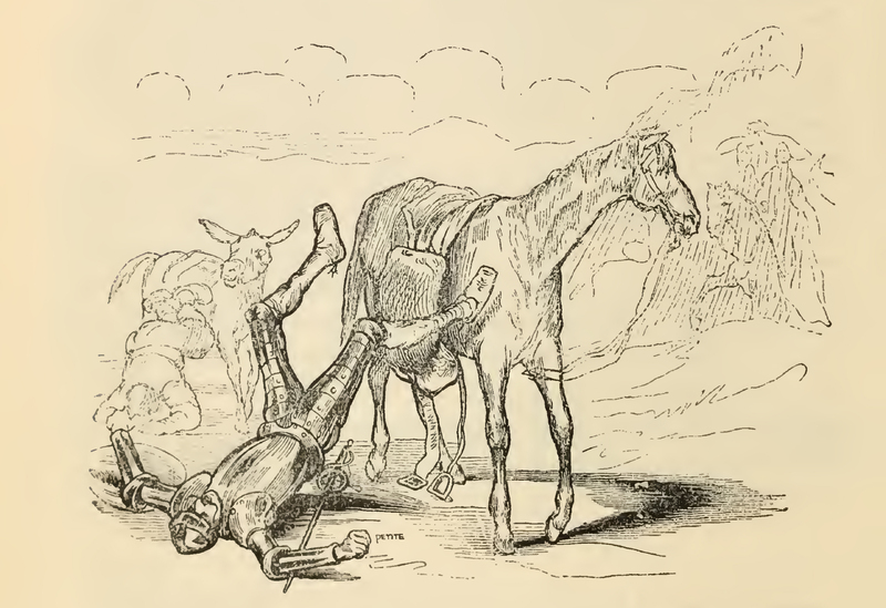 Don Quixote (middle), clad in armor, makes a show of alighting and throsw his body off Rocinante with a swing, carrying with him Rocinante's saddle, which was ill girthed, causing both him and the saddle to come falling to the ground. On the left, Sancho dismounts from Dapple, but his foot gets stuck one of the rope stirrups, and he hangs by it, with his face and arms on the ground. On the right, the duchess and her men are seen watching in the background.